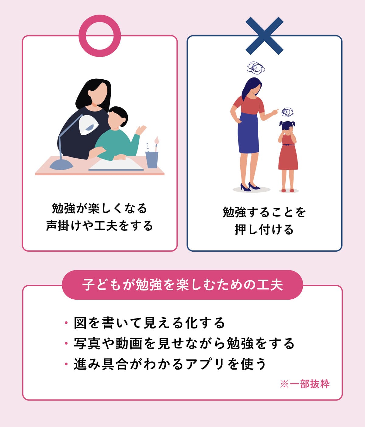 親が勉強することを押し付けてはいけない。子どもが主体的に勉強に取り組めるような働きかけや声かけをすることが大切。とくに低年齢の子どもは比較的親が誘導しやすい時期ではあるが、勉強量が多かったり、進めほうが不適切だと勉強嫌いになってしまうので、楽しく勉強に向き合える工夫が必要。