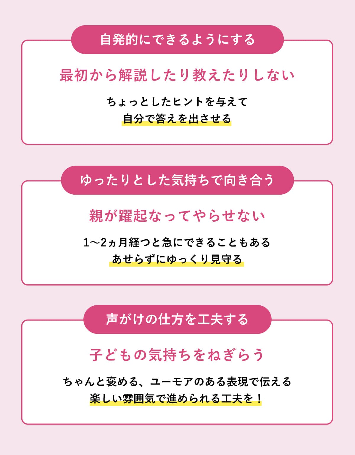 親が「どうしてできないのか」「この方法でやれ」と子どもに強制するのはよくありません。他にも方法はたくさんあるという前提で、子どもが主体的になれるように促しながら一緒に考えていくことが大切です。