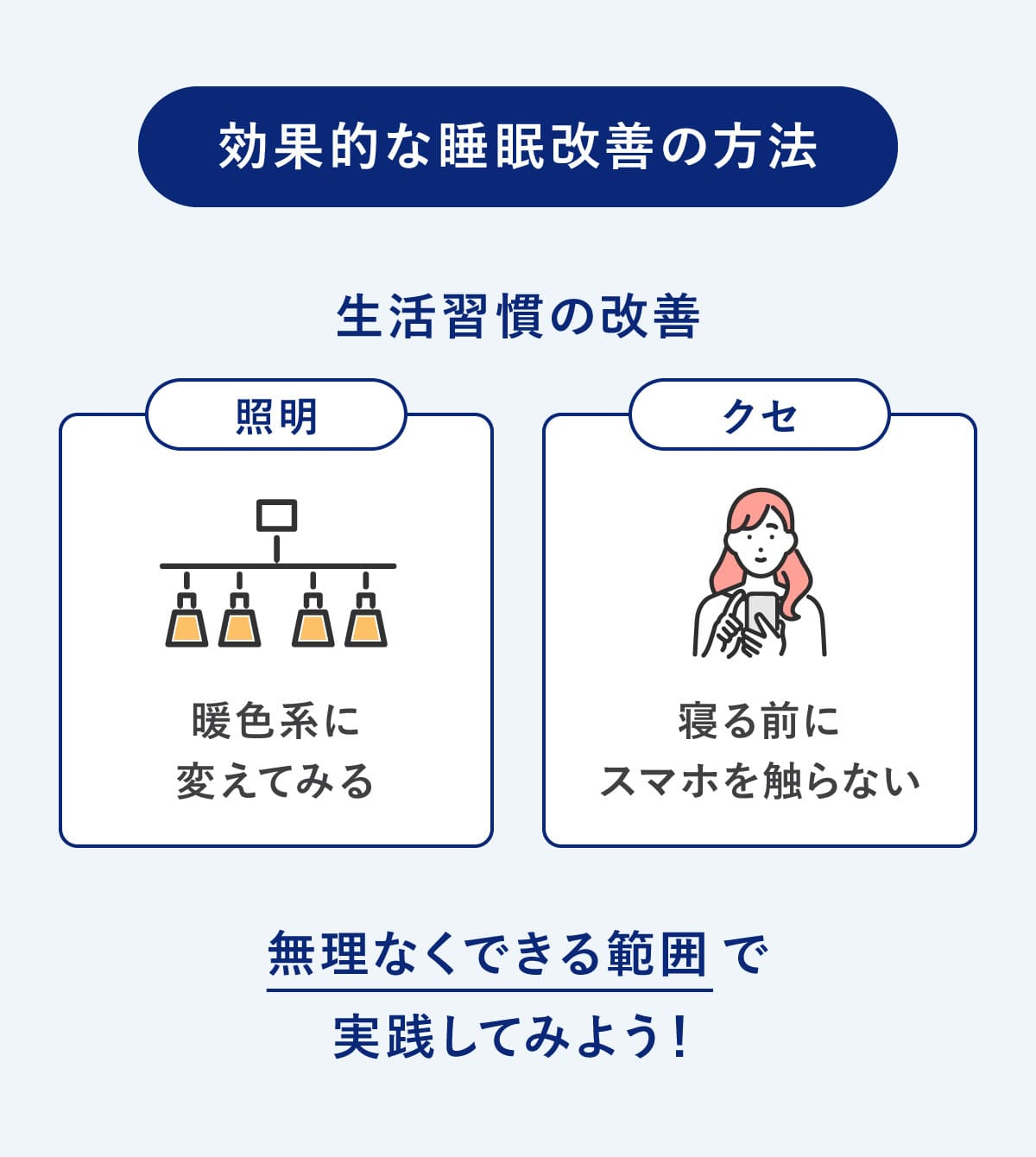 増田さん:基本的な部分になりますが、朝きちんと日の光を浴びる、日中に適度に身体を動かすなど生活習慣全体の改善が必要です。寝る直前の習慣でいえば、照明を暖色系に変える、寝る直前にスマホを触らないなども効果的でしょう。