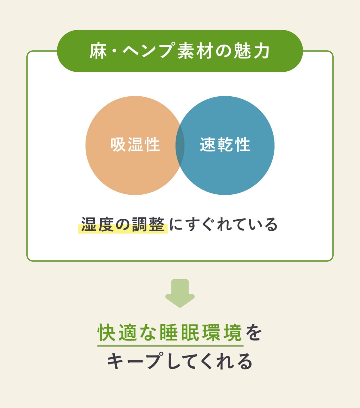 麻・ヘンプ素材は吸湿性に優れているため、夏でも冬でも布団内部の湿度の上昇に対応できる魅力があります。