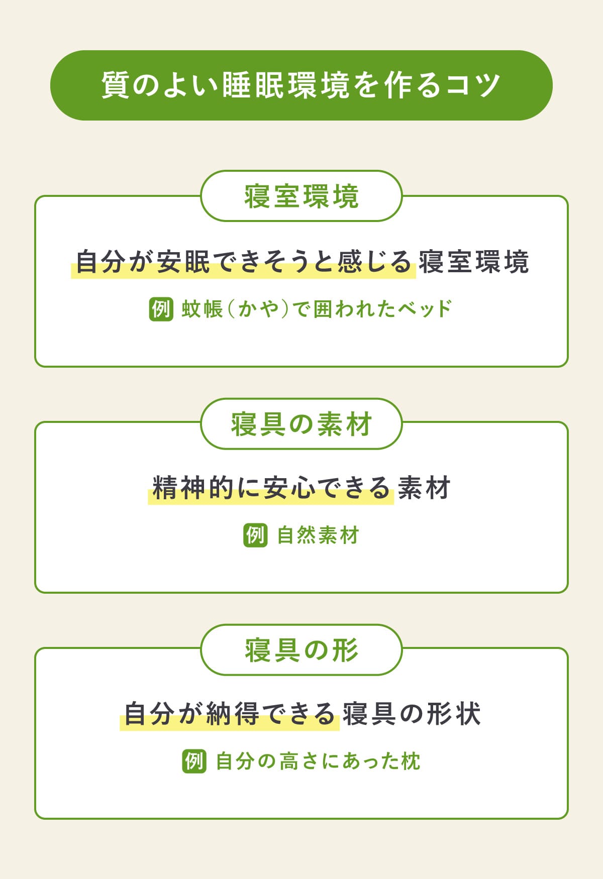── 自然素材に限らず、生活者に取り入れて欲しい睡眠習慣を教えてください。