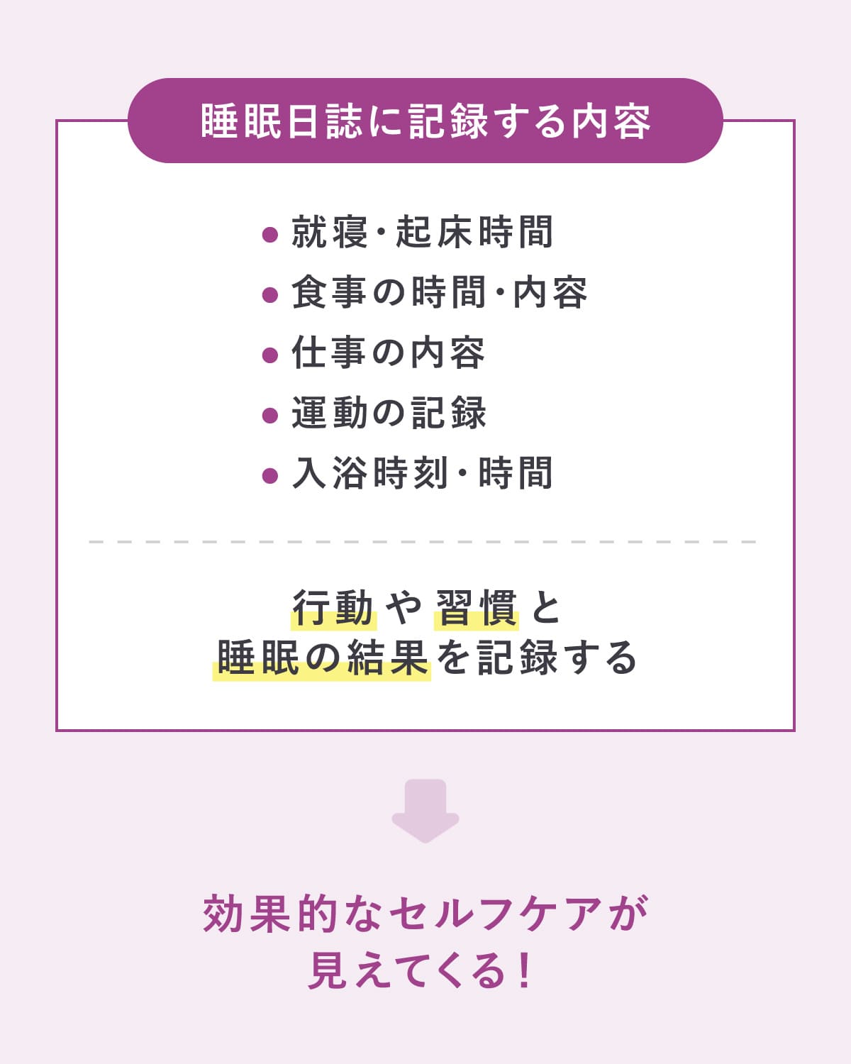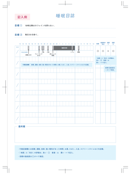 芝滝さん:自分にとって何が効果があるのかを知るためにも、「睡眠日誌」をつけることをおすすめします。日誌の媒体は、アプリでもノートでもなんでも構いません。眠りについた・朝目覚めた時間だけでなく、食事や仕事内容、そのタイミング、運動、入浴などの日中の行動習慣を記録してください。「何をしたらどんな睡眠になったのか」を紐付けていくことで、効果的なセルフケアが見えてくると思います。