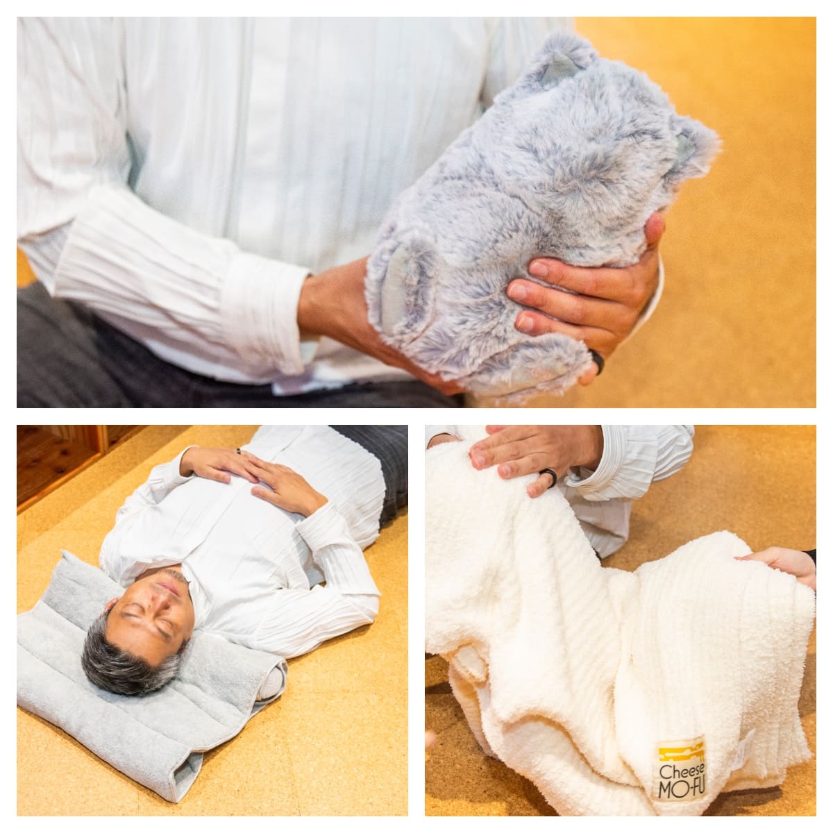 さらに中平氏は、肌ざわりと癒しを両立させたアイテムとして「チーズ毛布」と「うたたねこ」を紹介。「チーズ毛布」は、その名の通りチーズのように“とろける”触感が特徴で、滑らかな生地が肌にふわりと馴染む。一方の「うたたねこ」は、呼吸リズムを再現する猫型ロボット。お腹の膨らみと縮みで4秒吸って7秒吐く深い呼吸を再現し、抱きしめることで自然に呼吸が整い、心身がリラックスするという。