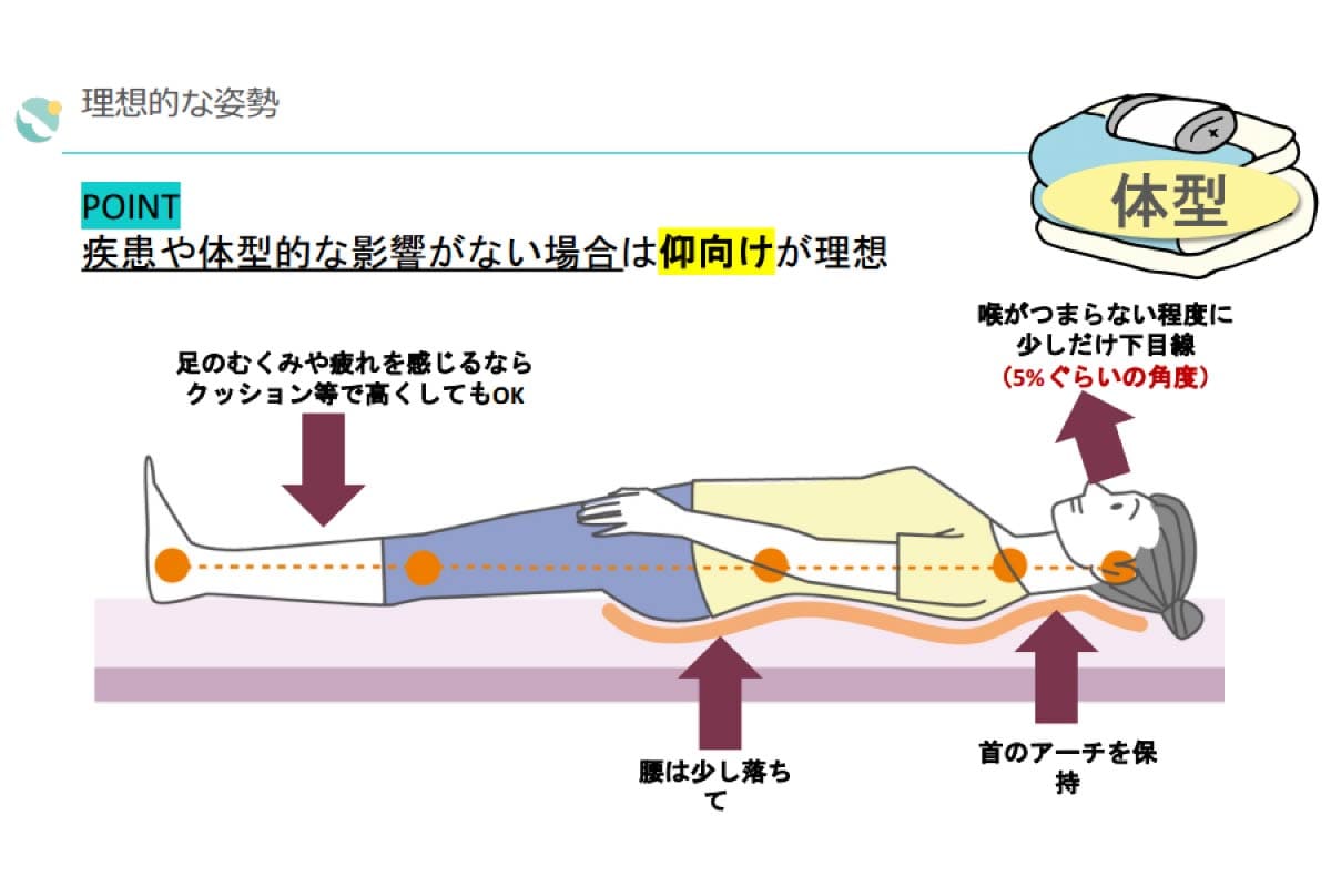 大木:人が寝ている時の理想的な姿勢は、日常の直立姿勢と同じ状態です。ご自身の布団や枕が、その自然な姿勢をサポートできているか、一度見直してみてください。