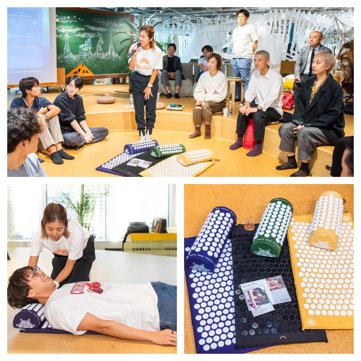 最初に登壇したのは、インドの指圧マットの販売を行うシャクティ・ジャパンのYuca氏。鍼と指圧のメリットを掛け合わせたセルフケアアイテム「シャクティマット」と「シャクティピロー」を紹介した。