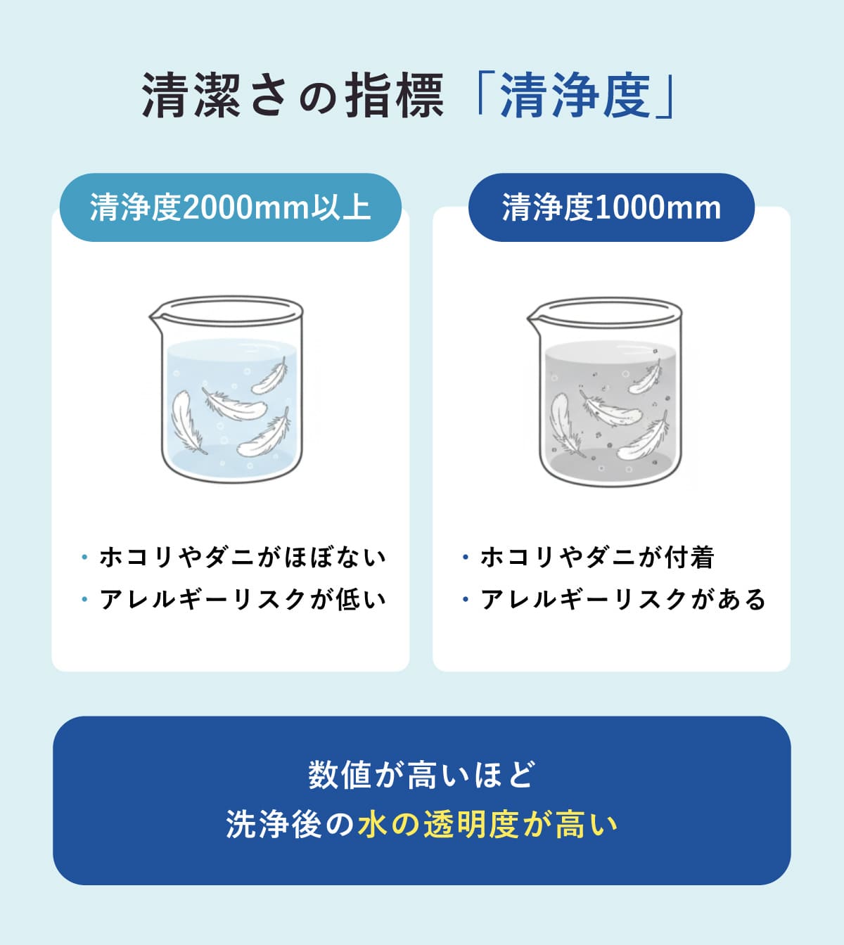 河田さん:「清浄度(せいじょうど)」というJIS規格で定められた試験方法があります。羽毛を洗浄したあとの水の透明度を測るもので、数値が高いほど清潔であることを示します。一般的には1000mm以上で汚れが落ちたきれいな羽毛とされています。