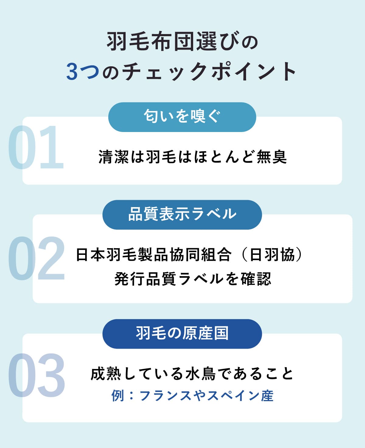 次に、製品についている品質表示ラベルも確認してみてください。信頼できる製品の1つの目安として、「日本羽毛製品協同組合(日羽協)」が発行する品質ラベルがあります。このラベルが付いている製品は、組合の定める品質基準をクリアしているため、一定の信頼が担保されています。