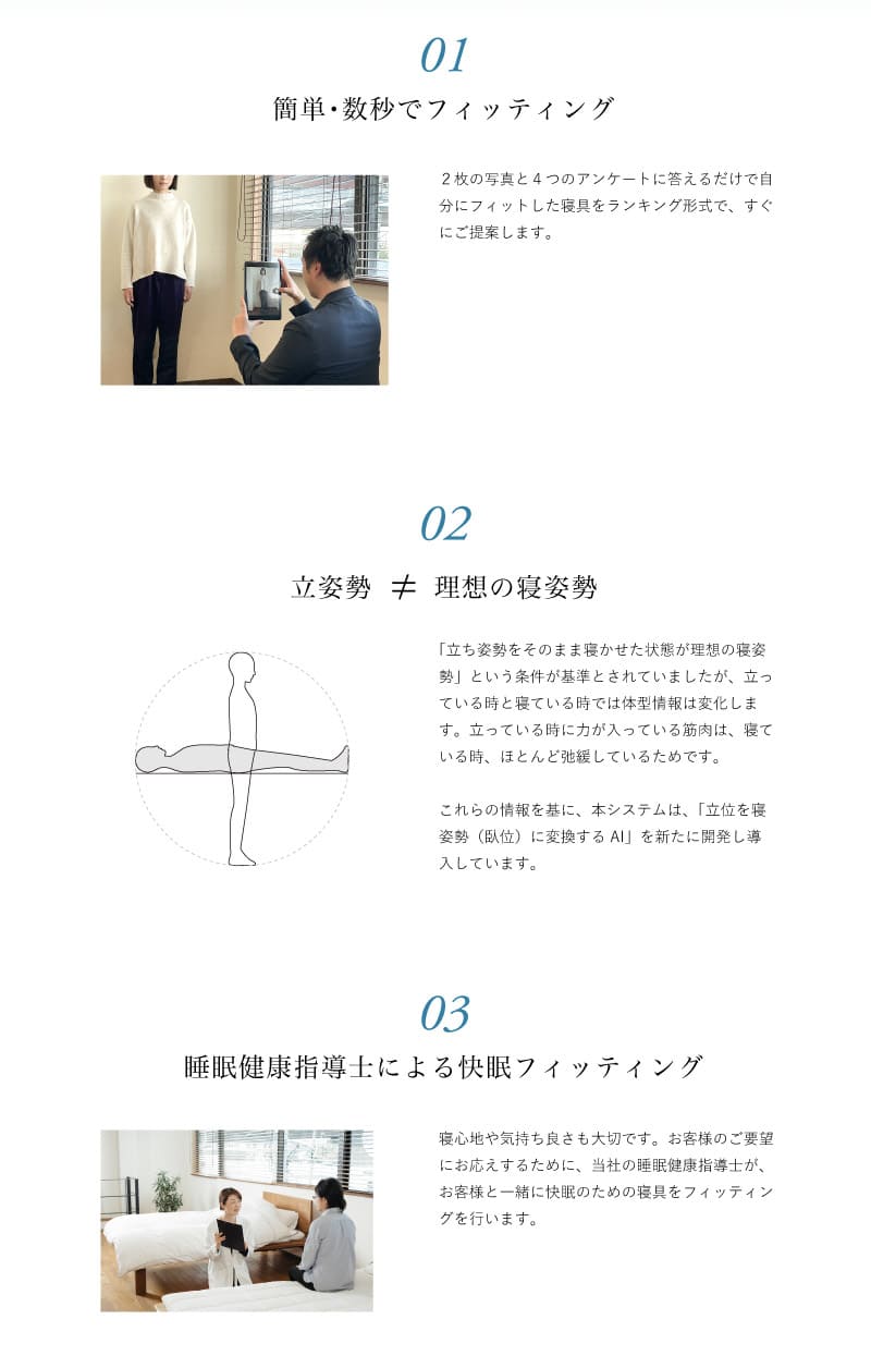 大東さん:はい!ですが、AIによる診断は、あくまで最適な候補を絞り込むための手段です。AIによる客観的なデータをもとに、睡眠の専門家(睡眠健康指導士)が生活者の好み、たとえば「もう少し硬いほうが好き」といった感覚的な部分をヒアリングして、最終的な調整をします。客観的なデータとプロの知見を組み合わせることで、本当に自分に合った寝具選びができるんです。
