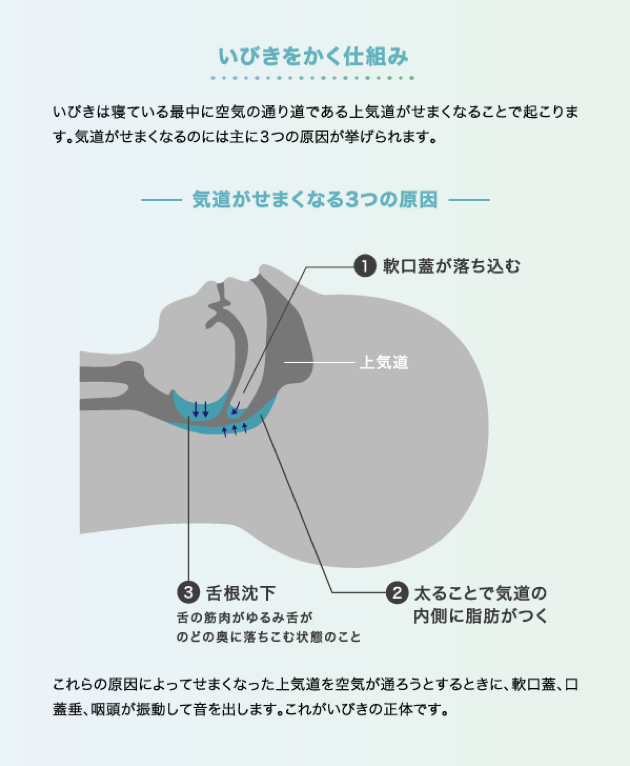地引さん:気道が狭くなる原因には、ホルモンバランスの変化や飲酒、疲労などが引き起こす筋肉のゆるみ、鼻の形や顎の大きさ、肥満などの身体的要因、寝るときの姿勢などがあります。寝るときの姿勢には、枕の高さなどがとくに影響します。