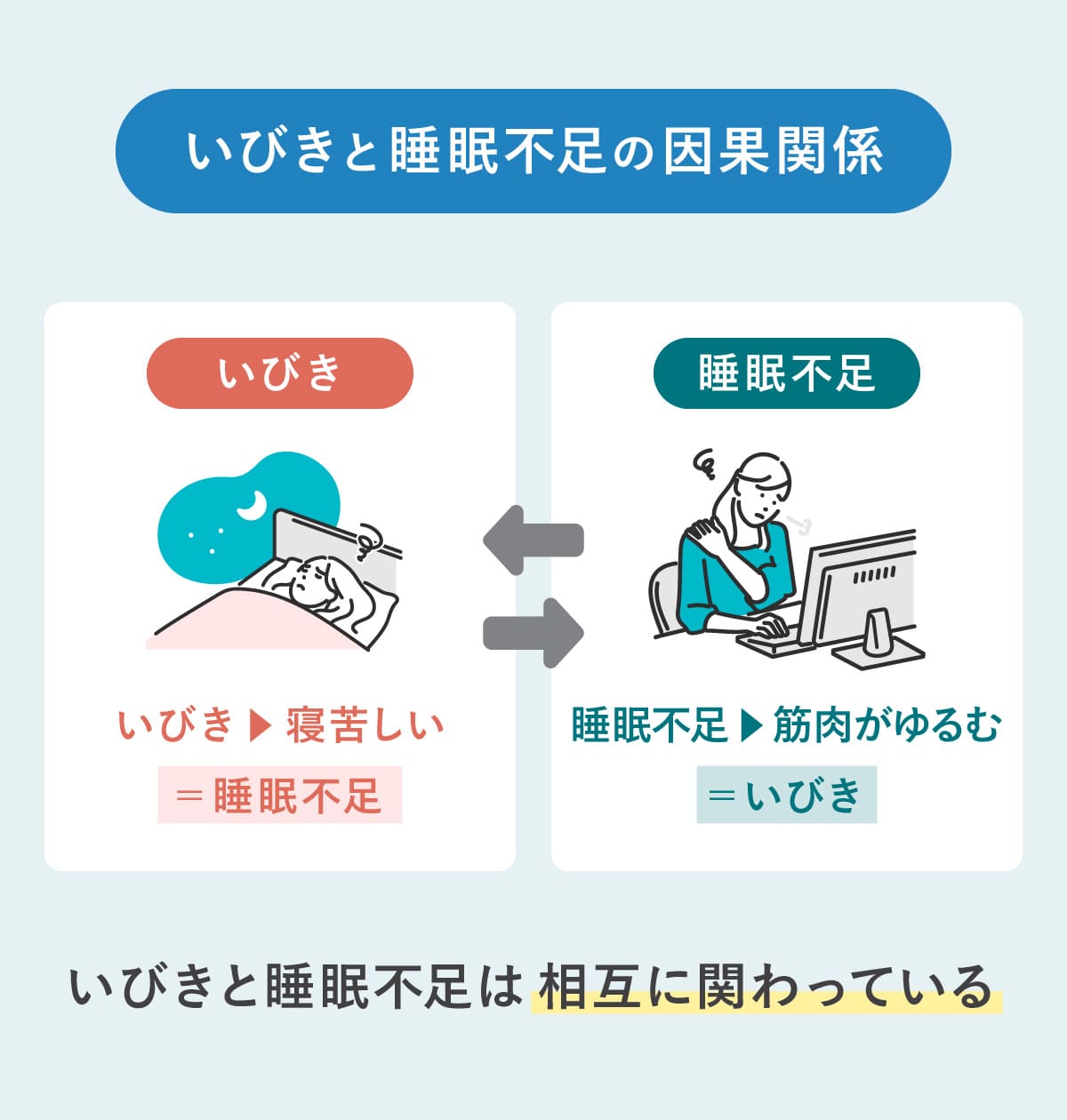 地引さん:いびきと睡眠不足には双方向に因果関係があるんです。いびきをかくということは、気道が狭くなっている状態です。酸素が吸いづらくなるので、息苦しくなり無意識に体勢を整えるために身体を動かして、途中覚醒してしまう。こうして睡眠不足につながります。