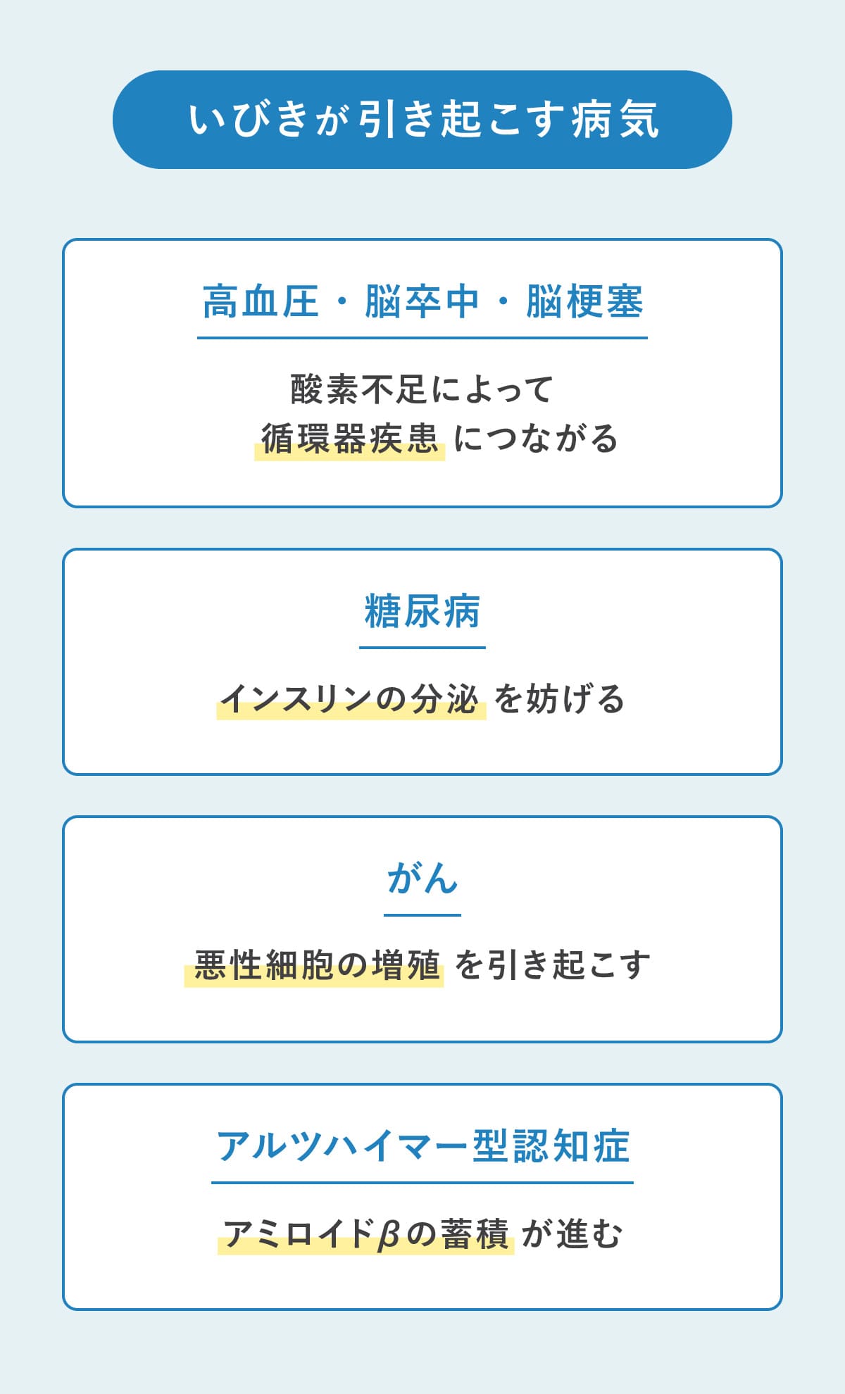 地引さん:さまざまな病気になるリスクが高まります。たとえば、高血圧、脳卒中、脳梗塞などの循環器系の疾患は想像がつきやすいですよね。ほかにも、インスリンの分泌に影響を与えることで糖尿病、酸素不足が悪性細胞の増殖につながってしまうためがんや脳内のアミロイドβの蓄積が進んでしまうことでアルツハイマー型認知症などのリスクも高まります。いびきや睡眠時無呼吸症候群は万病のもとと言えますね。