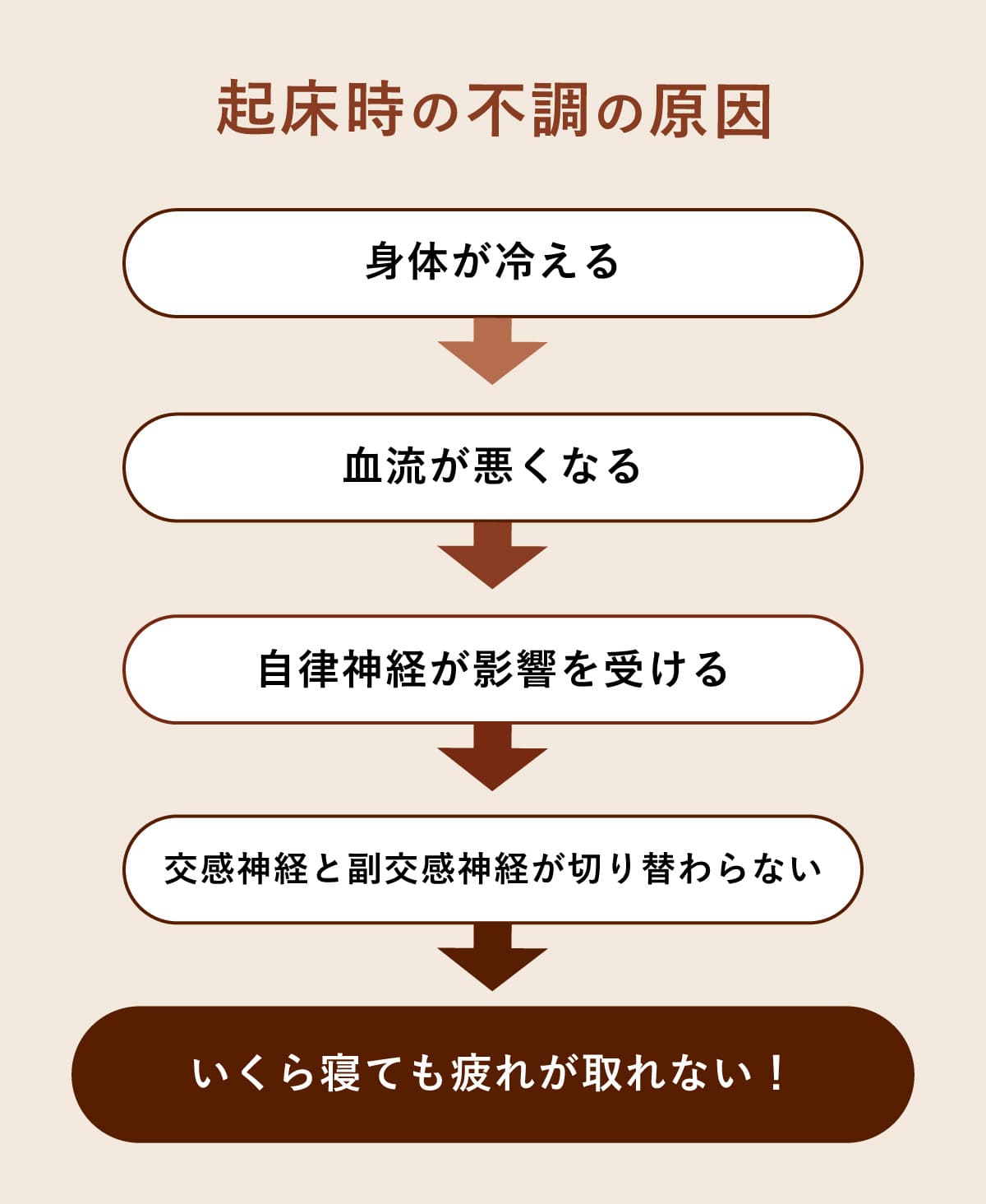寝ている間に身体が冷えると、血管がキュッと収縮して血流が悪くなります。血流が悪くなると筋肉の中に老廃物が貯まり、首周りの筋肉が硬くなってしまうんです。首周りの筋肉が固まると、自律神経の束が影響を受けて、寝ている間に交感神経と副交感神経が切り替わりづらくなってしまいます。