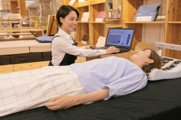 今藤さん:測定データはあくまで出発点です。結果をもとに実際に数多くの枕を試して体感していただきながら、細かくチューニングしていきます。寝ているときの環境や身体的な特徴についてヒアリングして、それぞれに最適な枕を提案しています。お客さんご自身に呼吸のしやすさや首や腰への負担はどうかなどを確認してもらいながら、一緒に寝心地を作り上げていくイメージですね。
