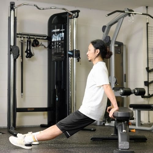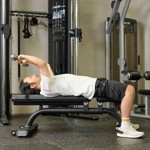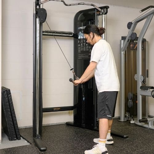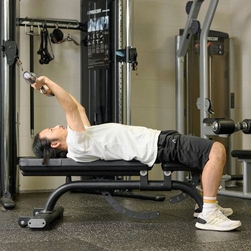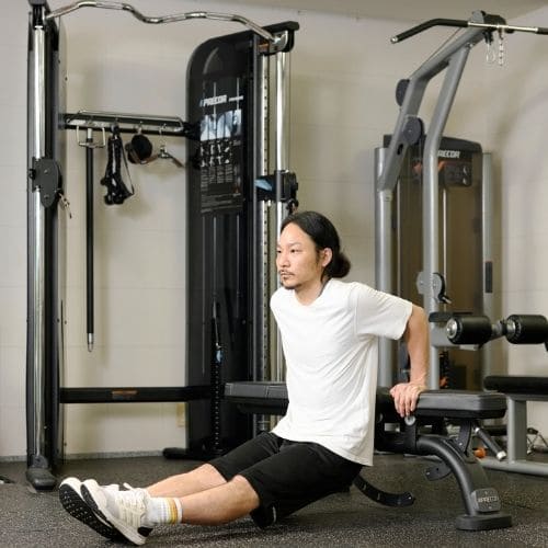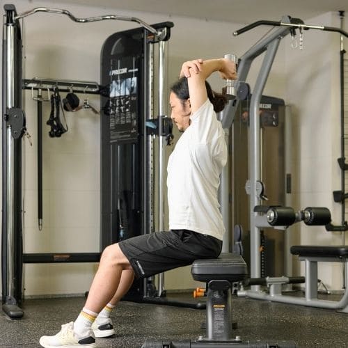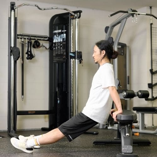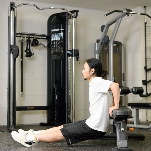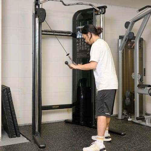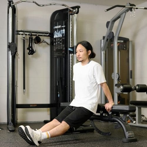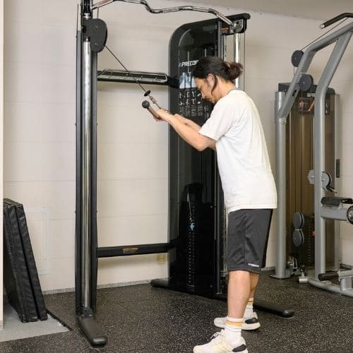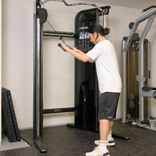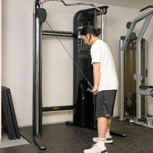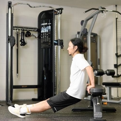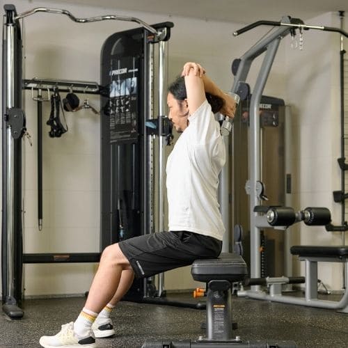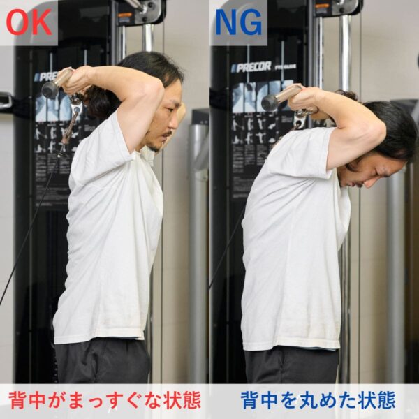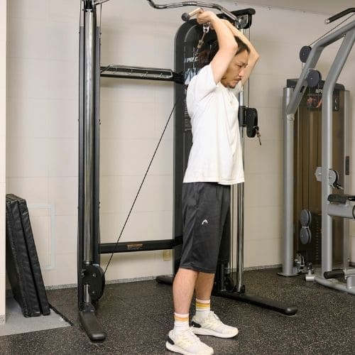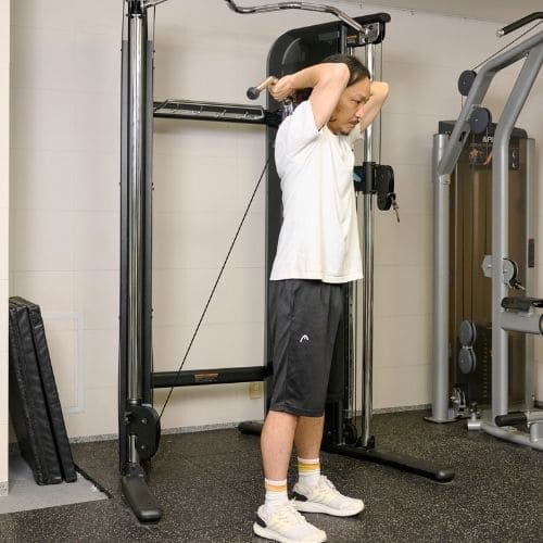 頭上での動作は長頭にしっかり入る一方、重くすると腰が反りやすかったです。背中をケーブルに向け、片足を半歩前に出すと体が安定し、ひじを高く保ったまま動かしやすくなりました。
