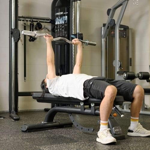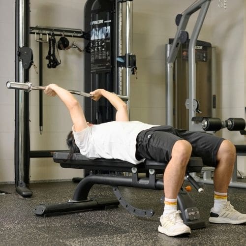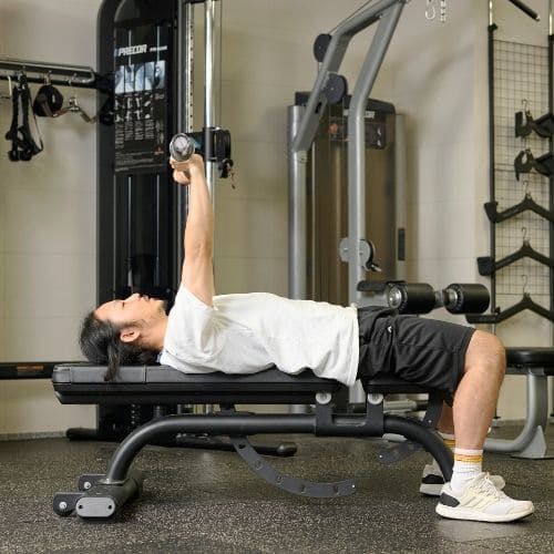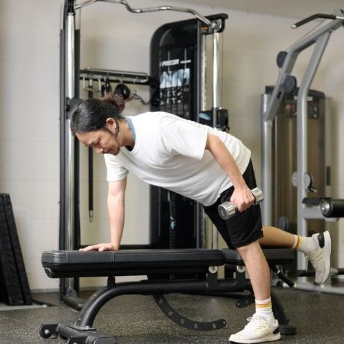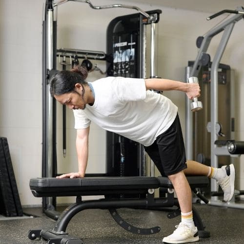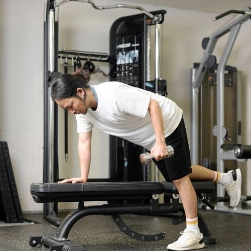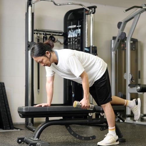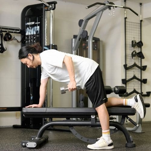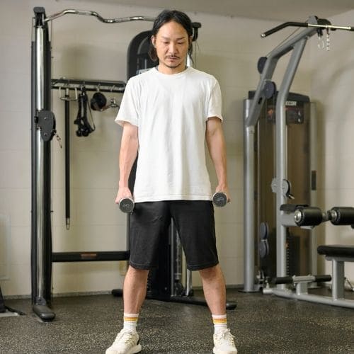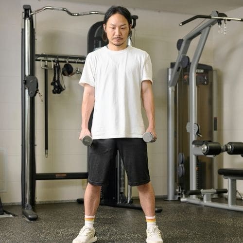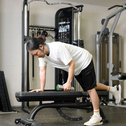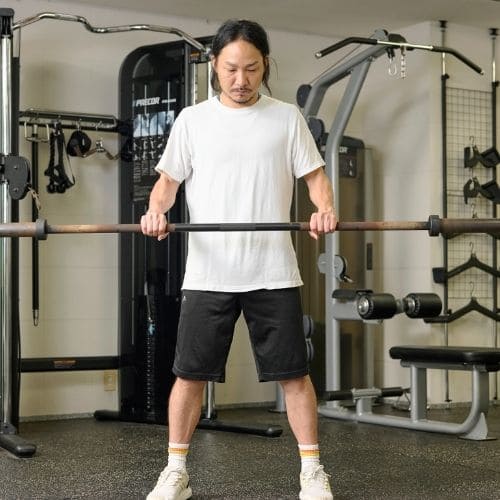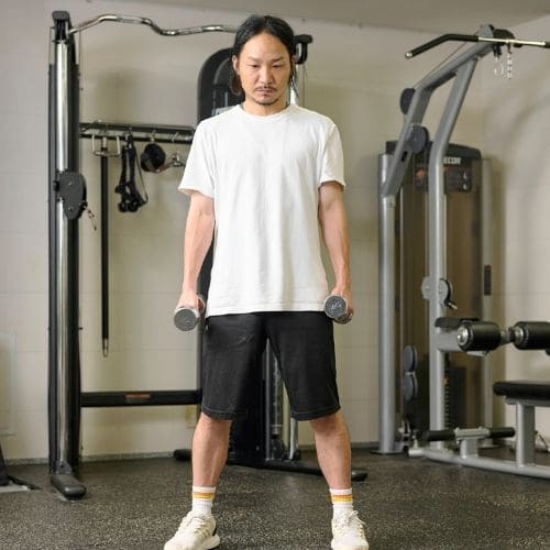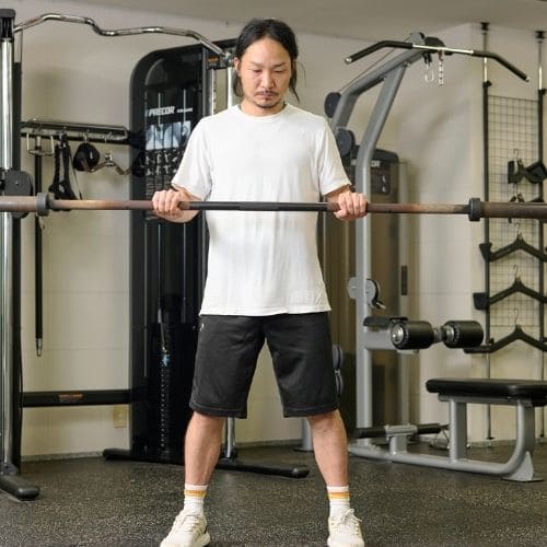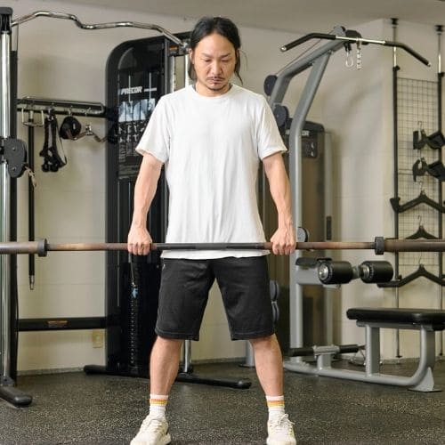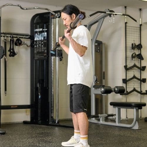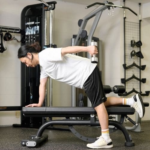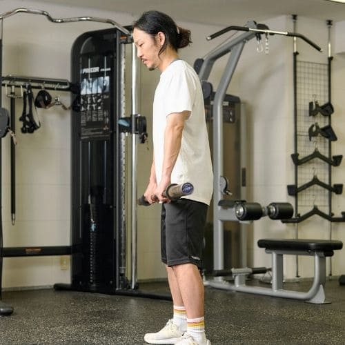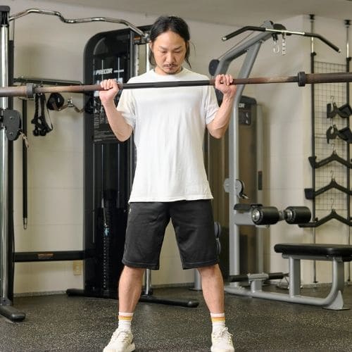 体幹の維持も大切なポイントです。肩関節可動域が狭い人は、可動域を1–2割控えるか、ダンベルの片手/両手版へ置き換えるのもおすすめです。