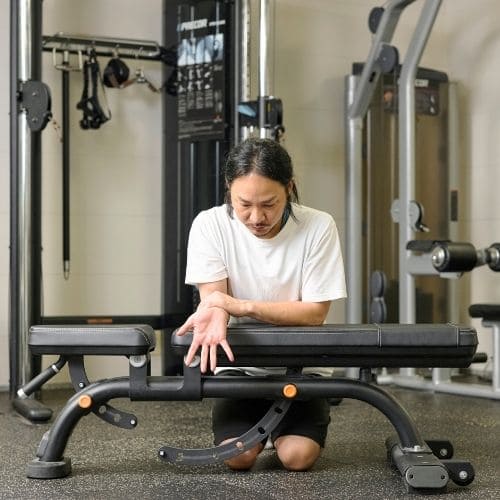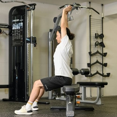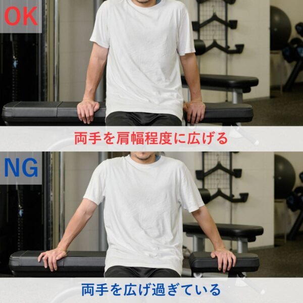 シート高は“わきがつぶれない高さ”に合わせ、上腕の裏面がパッドに面で当たるように設定しましょう。ひじはパッドの支点の真上で固定し、胸を軽く張るとフォームが安定します。
