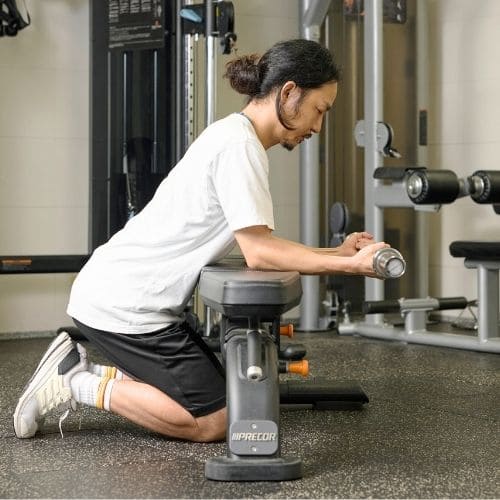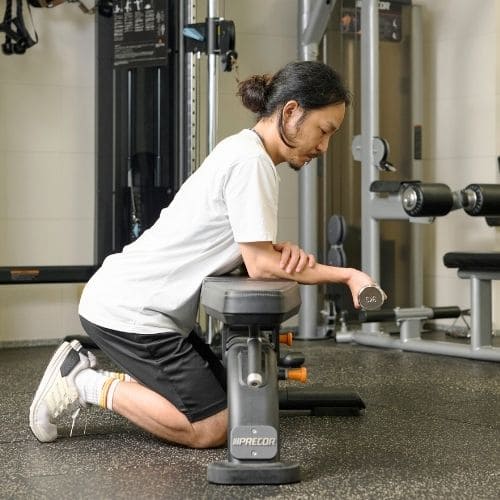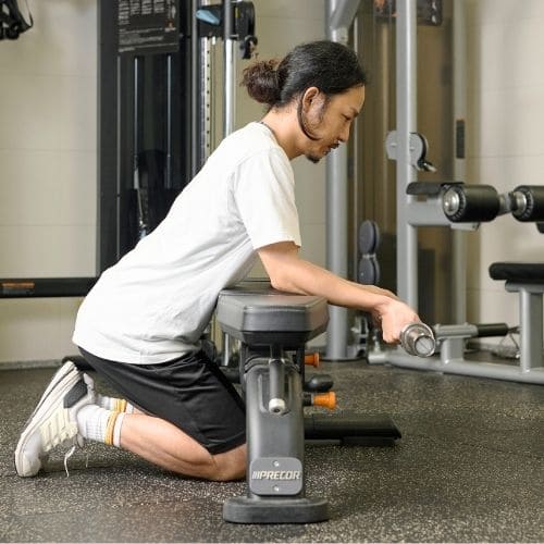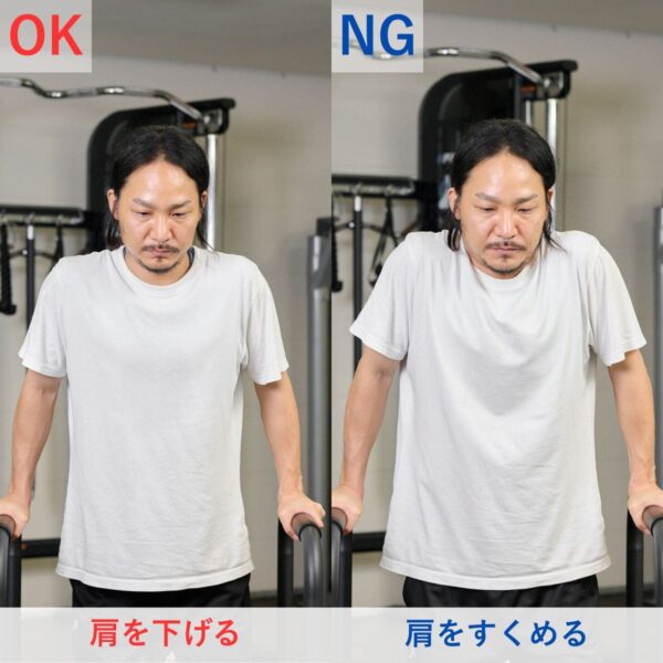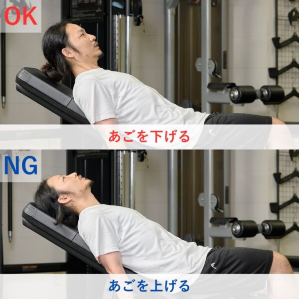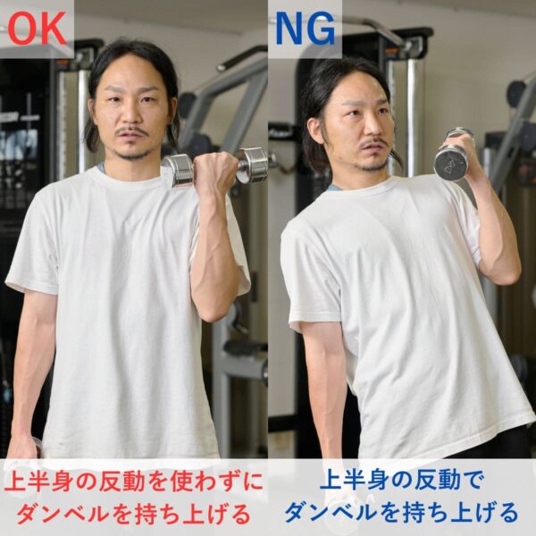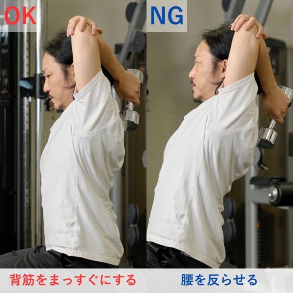 体の位置がブレやすいため、腹圧をしっかりとかけることを意識することが大切です。トレーニング動作時に、上腕が前後・左右にぶれない重量に設定しましょう。