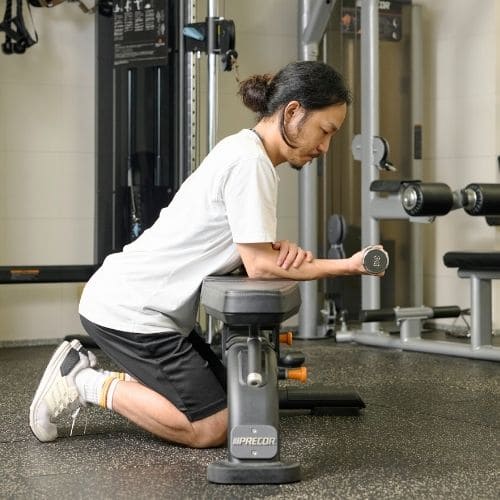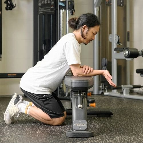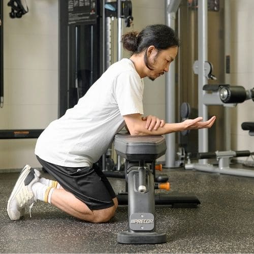 前腕屈筋群にしっかり入りますが、ひじが曲がると負荷が逃げやすいと感じました。前腕をベンチに固定し、手首だけを曲げ伸ばしすると効きが強くなります。