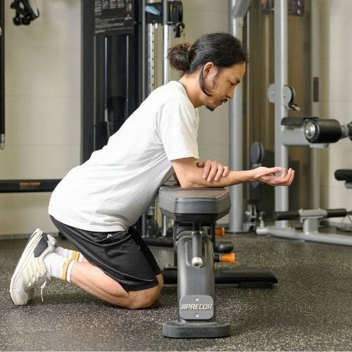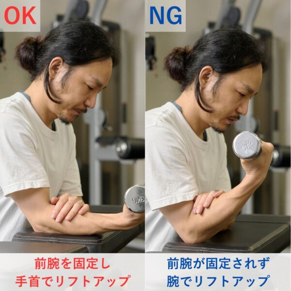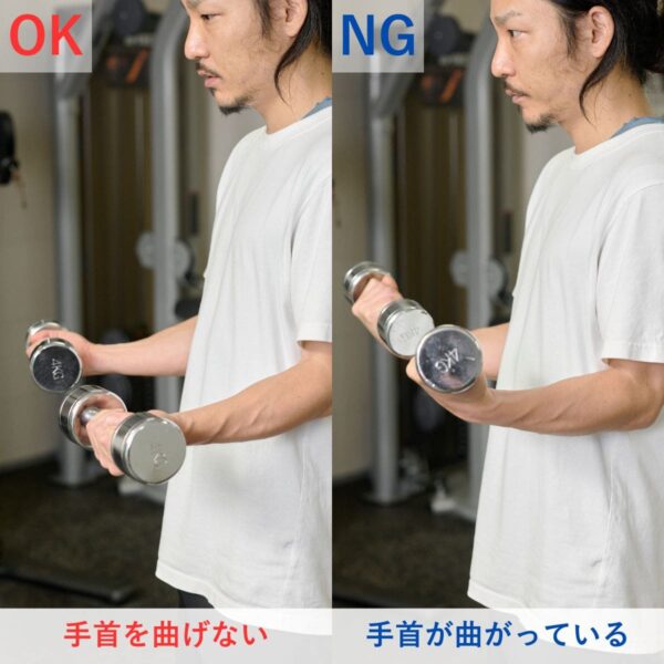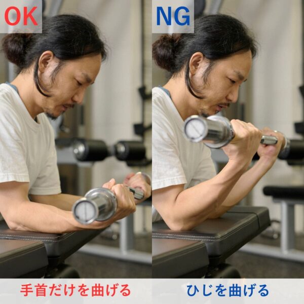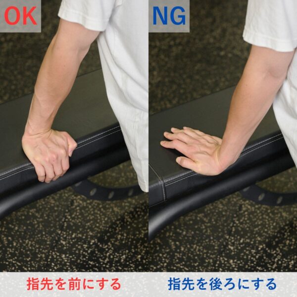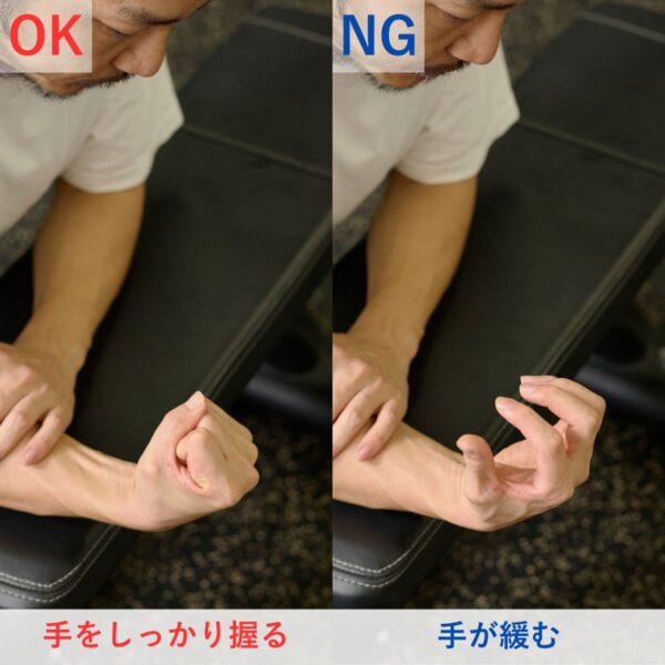 ひじを伸ばし、前腕をしっかり支持面に固定して“手首だけ”を動かしましょう。もし動作に違和感や痛みがある場合は、可動域を控える・重量を減らすなどで調整しましょう。