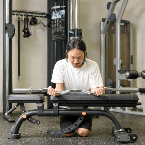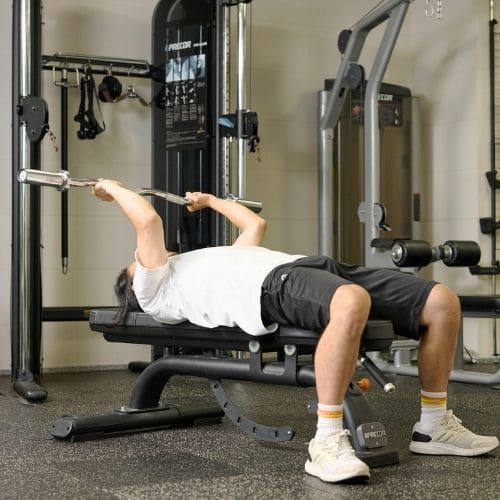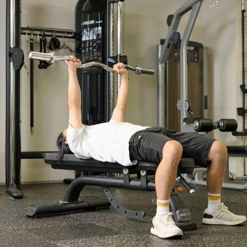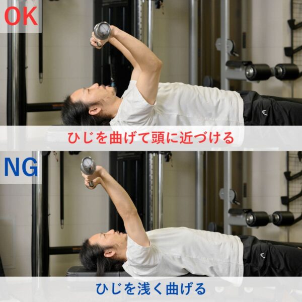 ひじを曲げながら、しっかり三頭筋のストレッチを感じることが大切です。ストレートバーよりEZバーを使う方法がおすすめ。