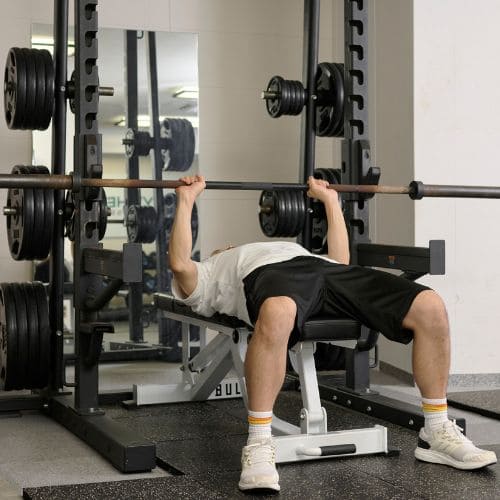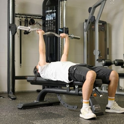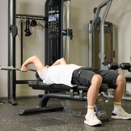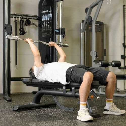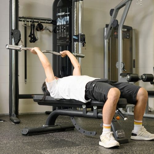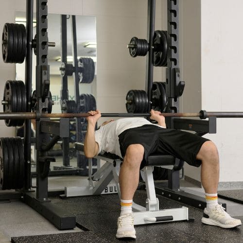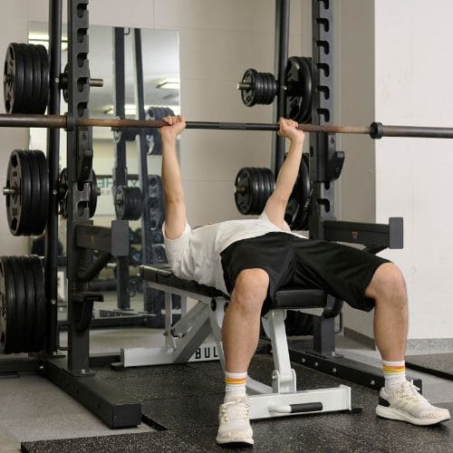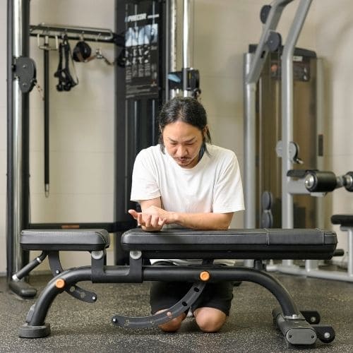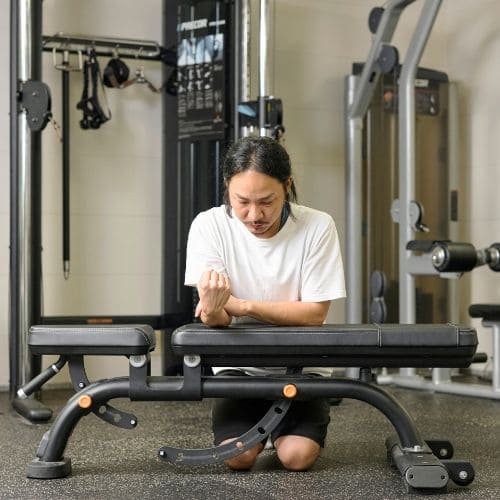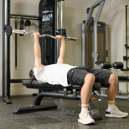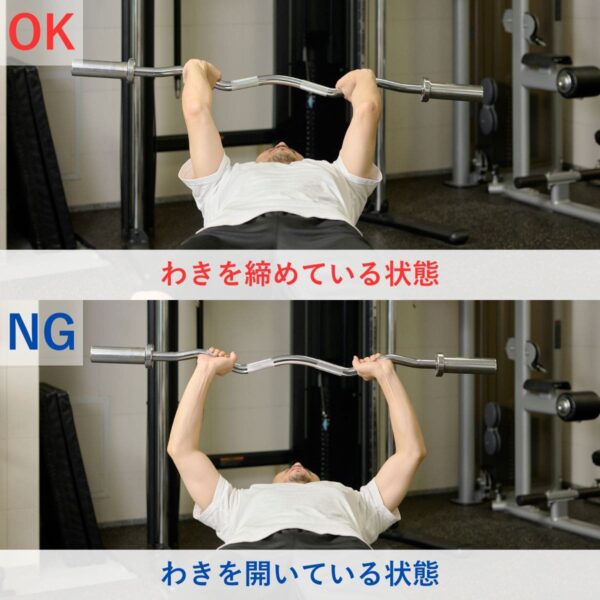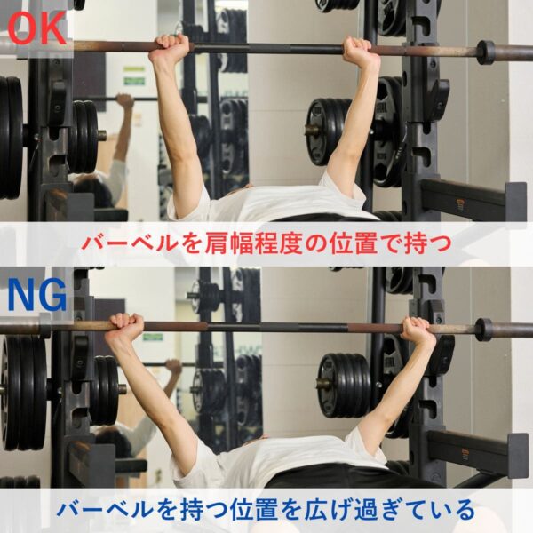 手首の負担を減らすためには、しっかりバーを手のひらに乗せ、手首を立て過ぎないことが大切です。手幅の目安として「前にならえ」のときくらいを目安にしましょう。また、スミスマシンを使うことで軌道も安定させやすくなります。