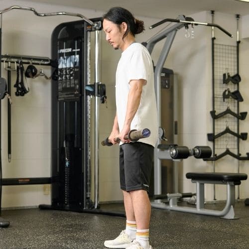 - 背中をケーブルに向けて立ちバーをにぎる