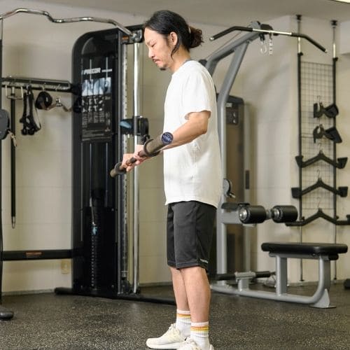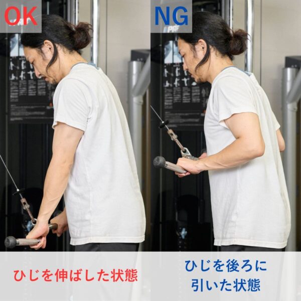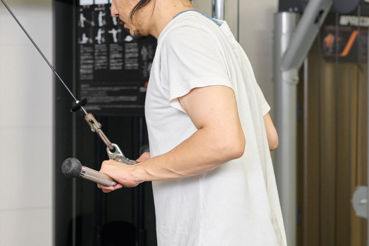 ケーブル種目の場合、軌道を安定させるのが難しくなります。開始前に肩を下げ、わきを軽く締め、ひじが後方へ流れないよう上腕をキープしましょう。