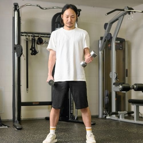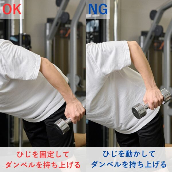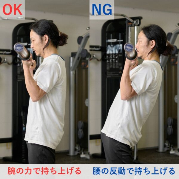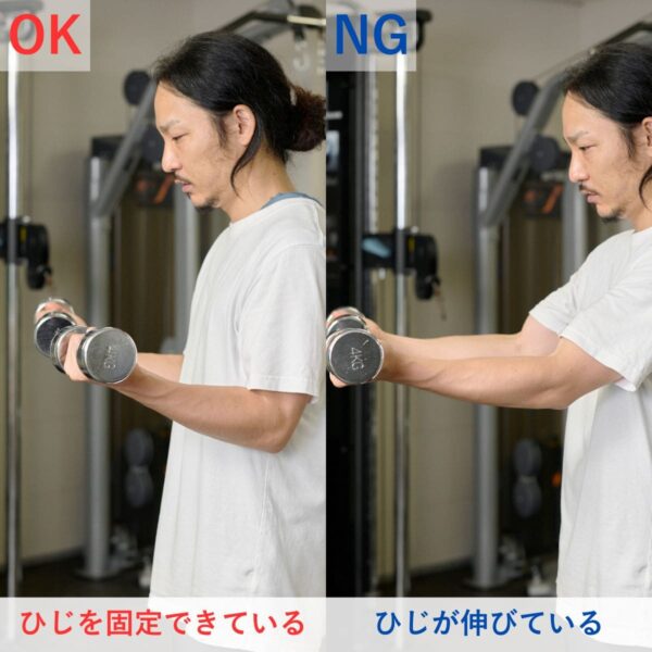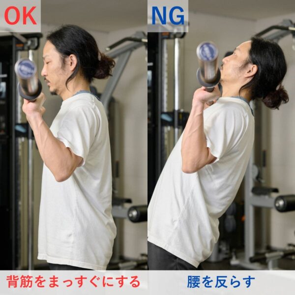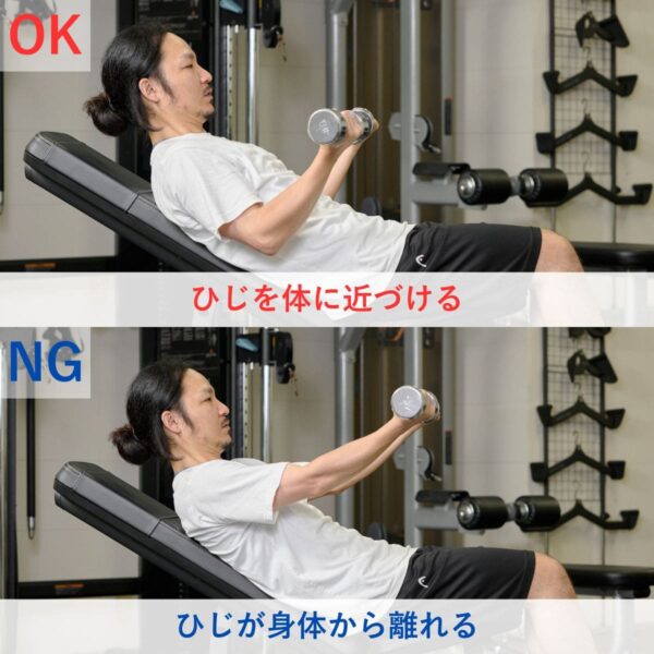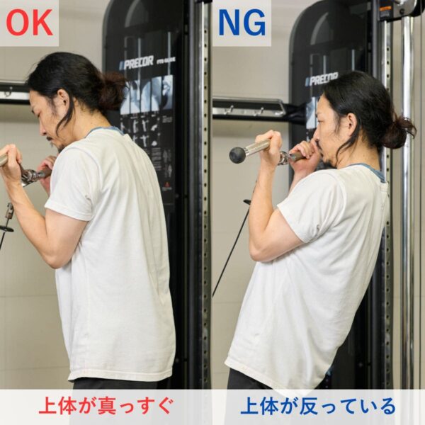 上体の反りを防ぐため、最初に腹圧を意識しましょう。ひじは体側の位置からスタート定し、上腕が前後にぶれない重量設定が基本です。