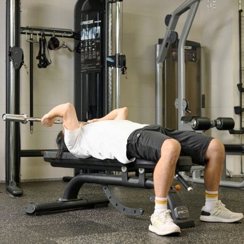 ひじを開くとひじ関節に違和感が出やすく、わきを締めると三頭筋に乗りやすかったです。バーを額〜頭上にコントロールして下ろすと、伸びと収縮がはっきりしました。