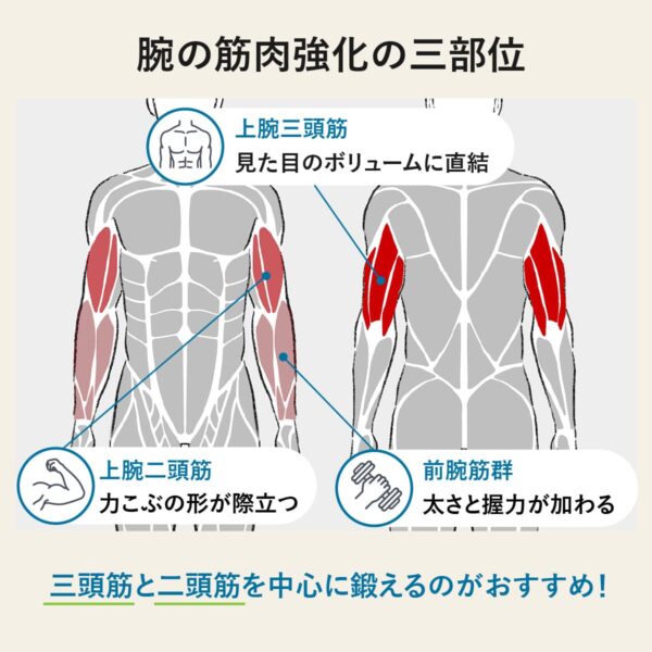 腕の太さを出すには 上腕三頭筋の強化が最重要。上腕の約3分の2を占めるため、見た目のボリュームに直結する。加えて 上腕二頭筋 を鍛えると力こぶの形が際立ち、 前腕筋群 を鍛えることで全体に太さと握力が加わる。3部位をバランスよく鍛えることが理想。