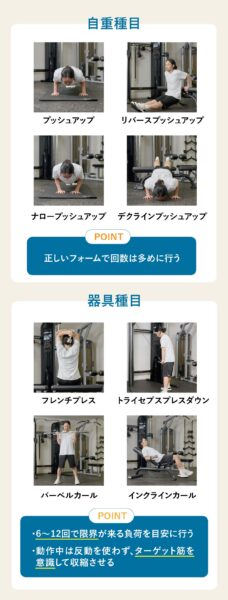 自宅ではナロープッシュアップなど自重種目を用い、正しいフォームで回数を多めにおこなう。ジムではダンベルカールやトライセプスプレスダウンなど負荷を調整できる種目で重量設定を工夫し、6〜12回で限界が来る負荷を目安におこなう。