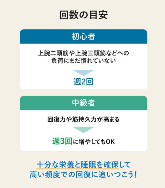 上腕二頭筋や上腕三頭筋などへの負荷にまだ慣れていないため、初心者は週2回が目安。十分な栄養と睡眠を確保することで高い頻度でも回復が追いつきやすい。