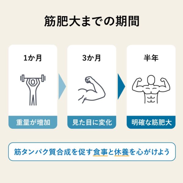 筋肥大は短期間で劇的に起こるものではなく、継続したトレーニングと栄養管理が必要となる。特に上腕二頭筋や上腕三頭筋は比較的小さな筋肉群のため、刺激と回復を積み重ねることが成果に直結する。