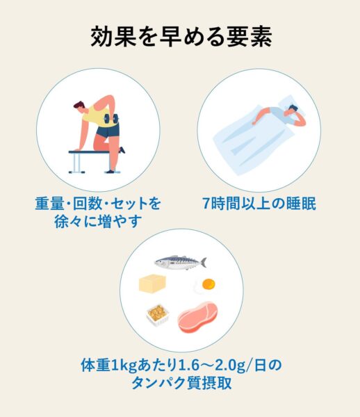 徐々に負荷を上げる意識を持ち、重量・回数・セット数を少しずつ増やす。さらに、週2〜3回の頻度を守りつつ、タンパク質摂取(体重1kgあたり1.6〜2.0g/日)と7時間以上の睡眠を確保することで、筋合成が最大化される。