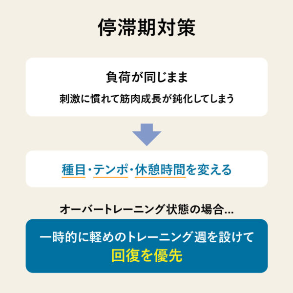 負荷が同じままだと筋肉は刺激に慣れて成長が鈍化するため、種目を変更する・回数やテンポを変える・セット間休憩を伸ばすなどで刺激を変化させる。また、オーバートレーニング気味なら1週間ほど軽めのトレーニングに切り替え、回復を優先することで再び伸びやすくなる。
