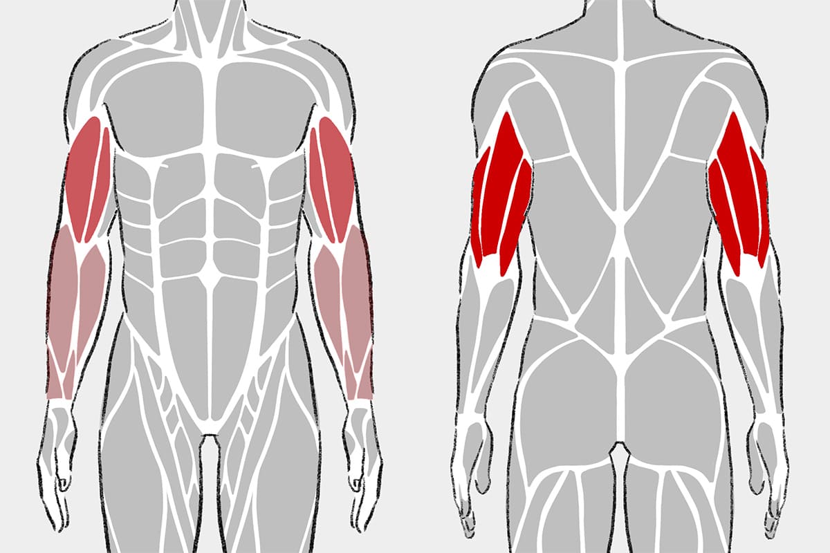 腕の筋肉は上腕二頭筋、上腕三頭筋、前腕筋群から作られている。それぞれの特徴・太さへの影響は異なる。