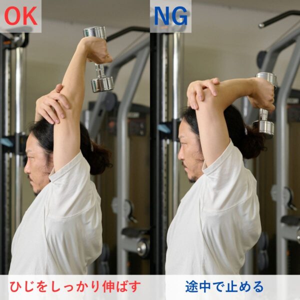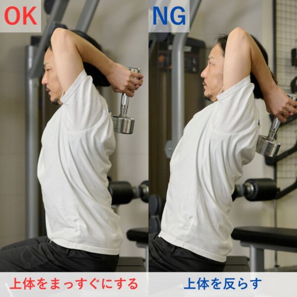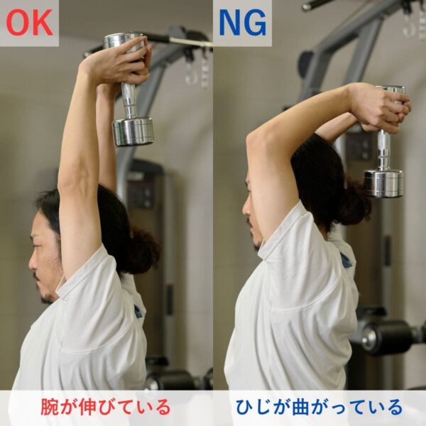 よくある間違いとして、「重量を追い求めすぎる」ことがあります。反動を使ったりフォームが乱れると、狙った筋肉に刺激が入らず、ケガの原因にもなります。特に三頭筋では、ひじが伸びきらず可動域が狭くなる、ひじが固定できないなどのケースが多く見られます。