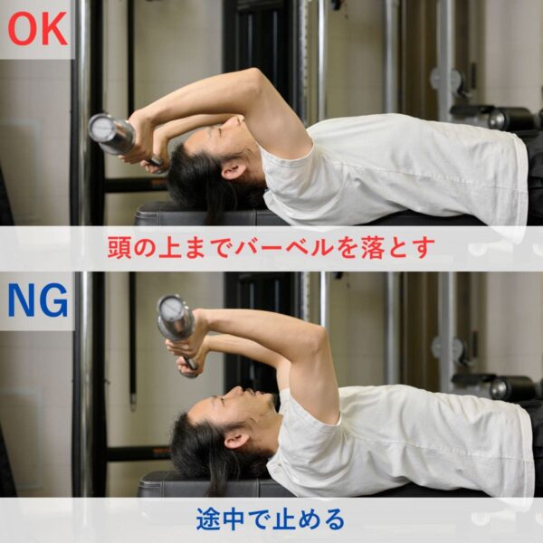 頭上まで動作を広げることで、三頭筋長頭に強く効きました。しかし、バーベルを頭上までしっかり下ろそうとすると腰が反りやすいので、腹圧を意識した方がよさそうです。