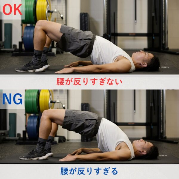 とくに腰の反りはよくやってしまいがちなので注意が必要です。背中をそらさず、股関節を軸に体を上げ下ろしする意識を持つとハムストリングに効かせやすくなります。
