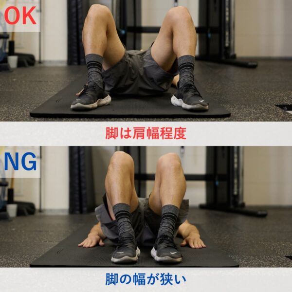 - 仰向けに寝てひざを90度に曲げ、足を床につける