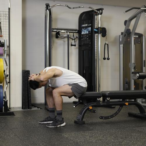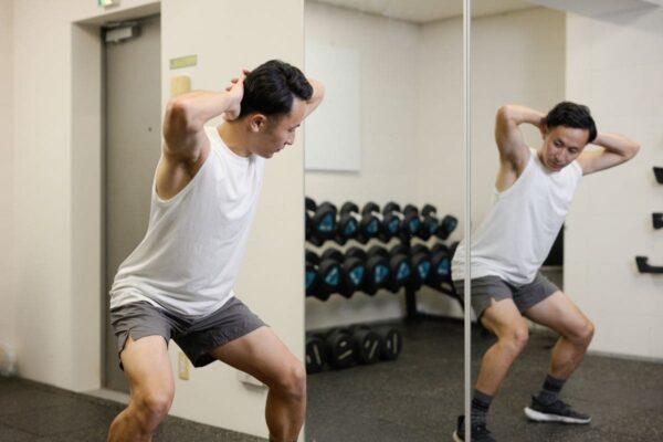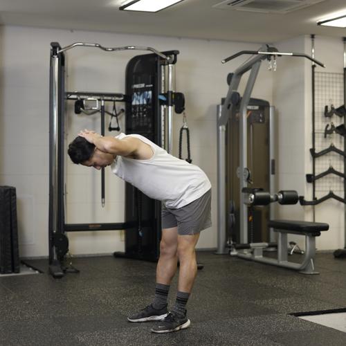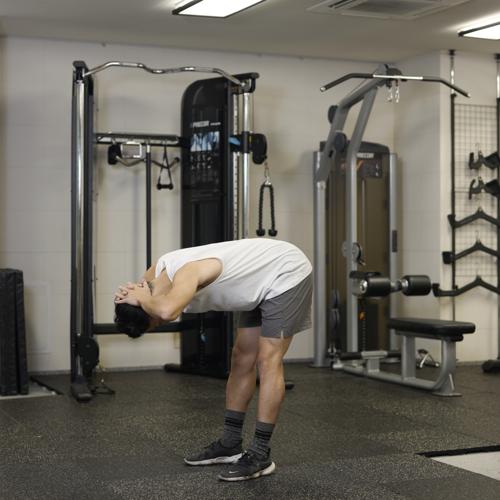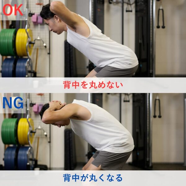 動作中は背中を丸めすぎず、股関節から身体を倒すことを意識するとより安全で効果的におこなえます。