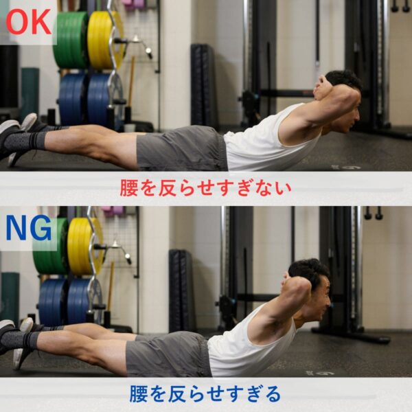 フォームが崩れると腰痛の原因になるので、まずは少ない回数から正しいフォームでおこなうことを意識しましょう。