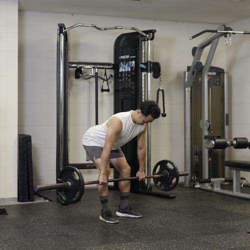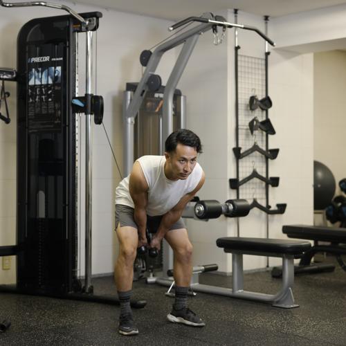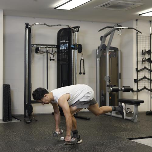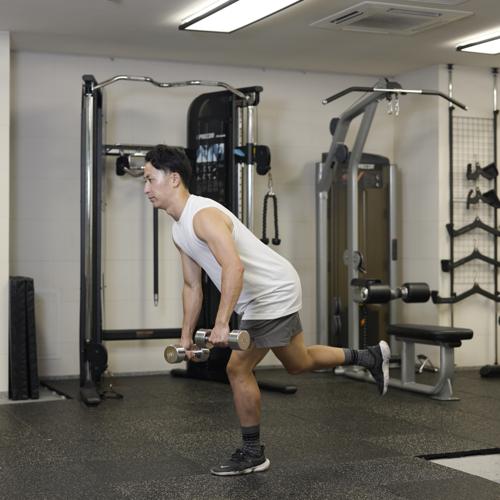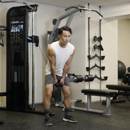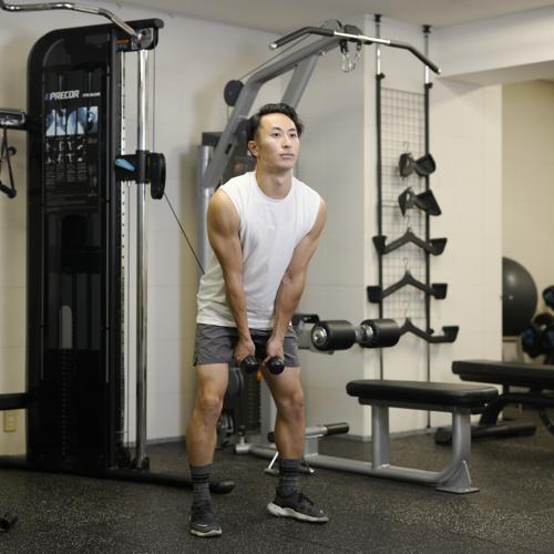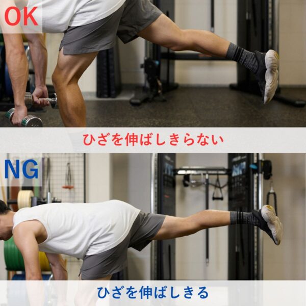 最初は軽めの重量で正しいフォームを習得しましょう。深く倒れなくても股関節を軸に深いおじぎをする感覚で行うことで、ハムストリングがストレッチされます。