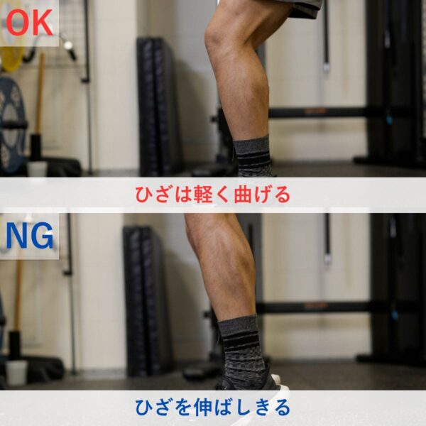 ハムストリングはひざ関節と股関節の両方に関わるため、ひざを伸ばしきってしまうと、先にふくらはぎの筋肉が伸びきってしまい、十分にハムストリングスが伸ばせません。