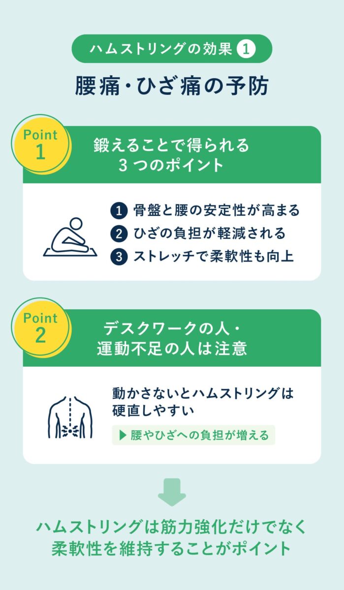 とくにデスクワーク中心の生活や運動不足の人は硬直しやすく、腰やひざへの負担が増える。ハムストリングを鍛えることで骨盤周囲の安定性が高まり、腰椎へのストレスを軽減できる。