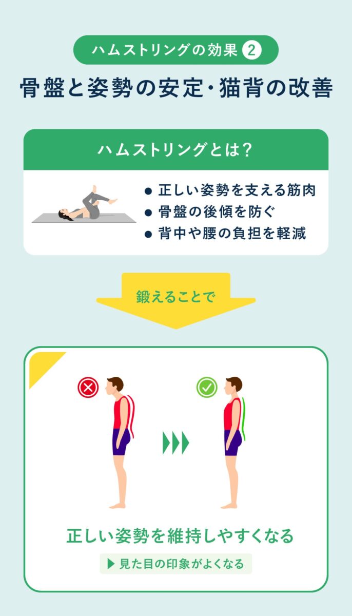 ハムストリングはひざや股関節の動作に関わるだけでなく、体幹や背筋と連動して骨盤を正しい位置に保つ役割を担う。ハムストリングスの柔軟性が低下すると骨盤が後傾しやすく、猫背や反り腰といった姿勢不良を引き起こしやすい。