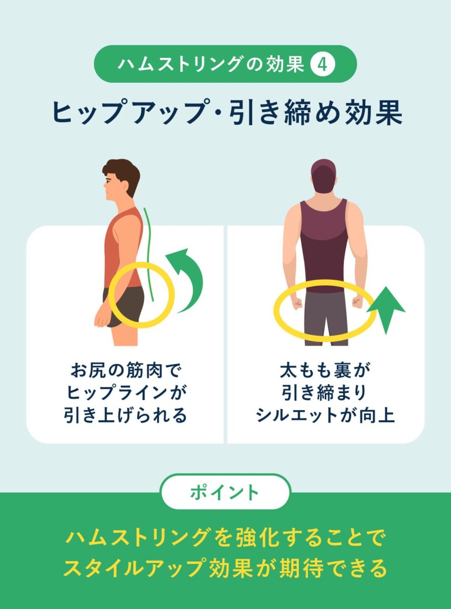 お尻と太もも裏は筋肉が協働してはたらくため、同時に鍛えることでスタイル全体が大きく変化する。ハムストリングスのトレーニングをするとヒップラインを引き上げが増し、自然にヒップアップ効果が得られると同時に太もも裏の余分な脂肪が引き締まり、脚の後ろ姿がすっきりと整う。