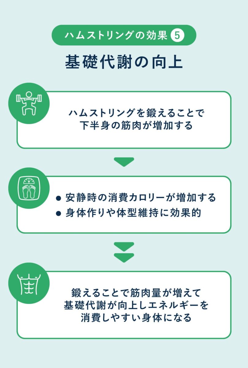 ハムストリングは下半身を構成する大きな筋肉群であり、鍛えることで筋肉量が増加し、基礎代謝の向上につながる。