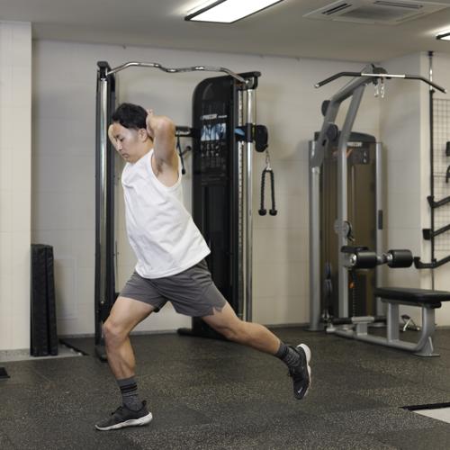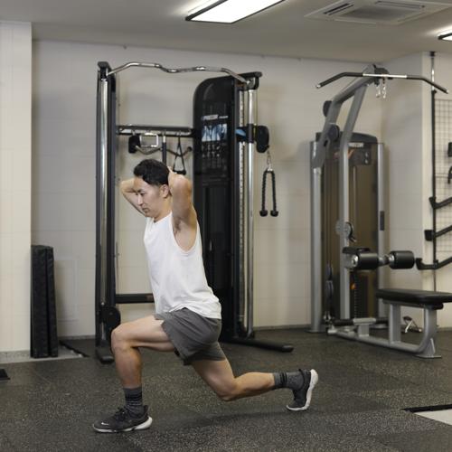 トレーニング前にはレッグスイングなどの動的ストレッチをおこない、筋肉を温めつつ関節の可動域を広げることが大切。動作準備が整うことでスムーズに力を発揮でき、ケガの予防にもつながる。