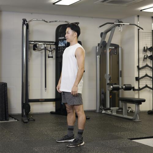 - 足を肩幅に開き直立する